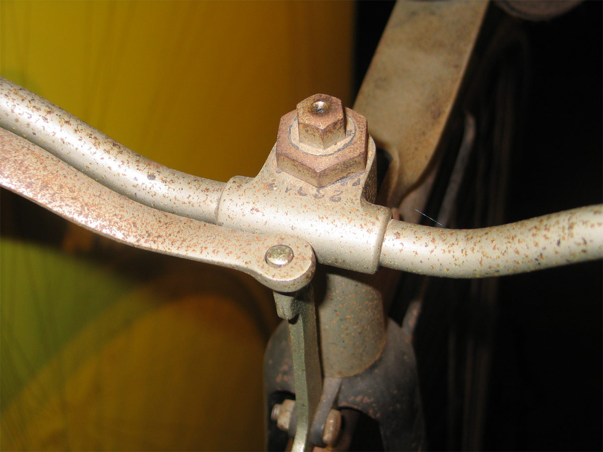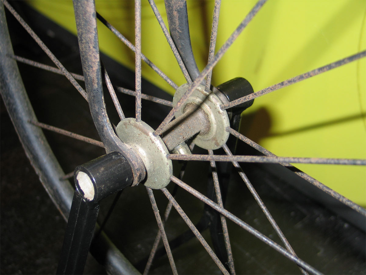 Beautiful original bike with original nickle and all the details right. Serial number 26942 (estimated 1885-1886) is visible on right side of the neck and on handlebars. With this number we can date it in or around 1885. If I am not mistaken, this bike has single row ball bearing front and cone bearings on the rear hub. This was not the most expensive bike that Premier made, but with its hollow forks it is not bad either.